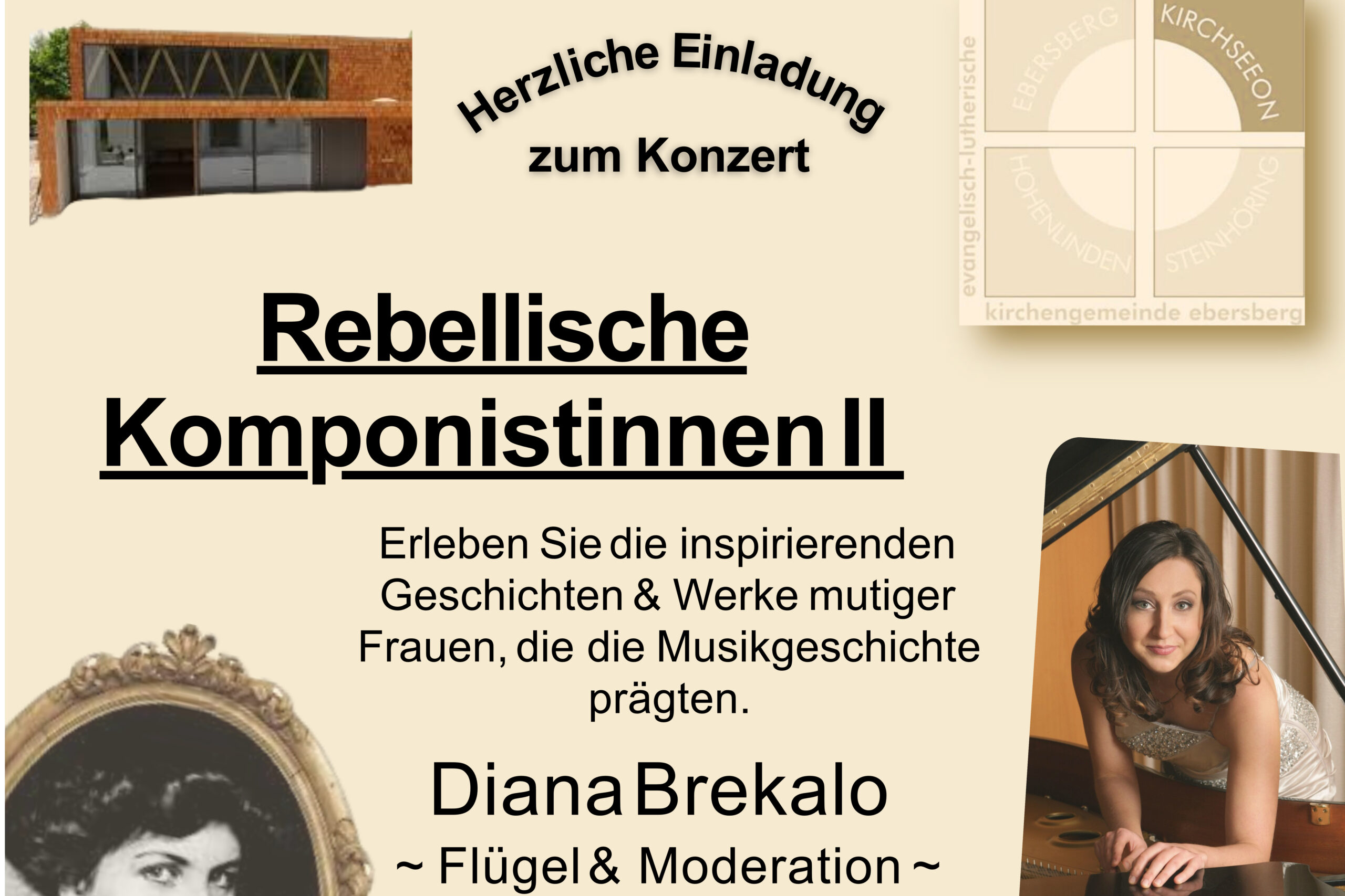 Wir freuen uns, dass unser generalsanierter Flügel wieder im Gemeindehaus angekommen ist. Seine Rückkehr feiern wir mit dem zweiten Konzert der Pianistin Diana Brekalo am 10. Mai 2026 um 18 Uhr im Gemeindehaus in Kirchseeon. Bereits im letzten Jahr konnte Frau Brekalo mit ihrem Konzert „Rebellische Komponistinnen“ überzeugen, dieses Jahr wird sie uns mit Werken von Coccia, Garcia, Kashperowa, Beach, A. Mahler, H. Bosmans, F. Kuckuck und anderen erfreuen.